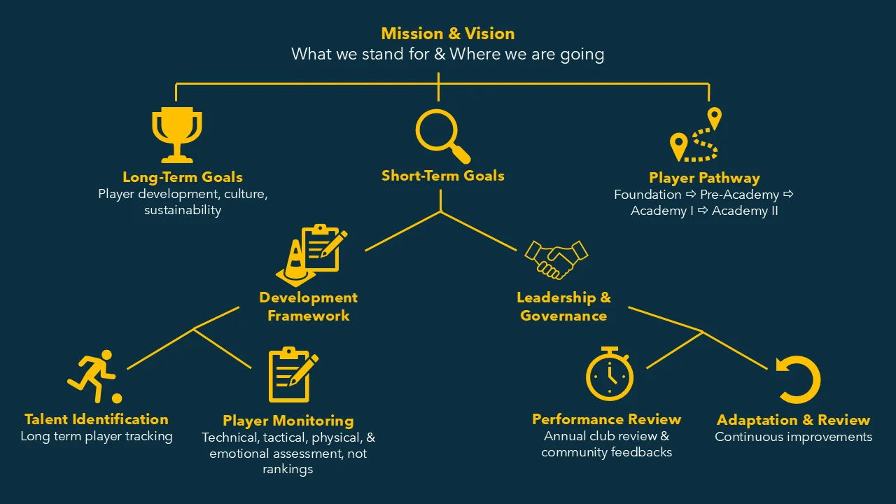 We aim to help every player reach their potential—on the field and beyond—through high-quality coaching, age-appropriate training, and clearly defined standards.